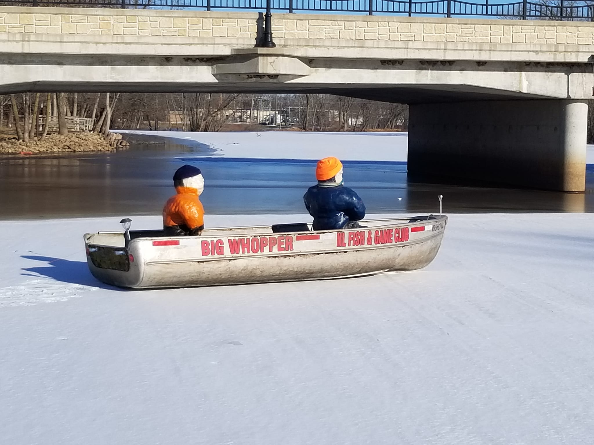 When the club started the contest in the early 1950’s they fashioned two dummies named “Pete and Joe” into a boat and placed them out on the ice below the Pearl Street bridge. A string attached to the boat ran to a clock near the bridge, when the boat floated out, the string was pulled and the clock would stop. The official ice out time was then recorded. Each year you can find “Pete & Joe” in their boat waiting for the ice to go out.